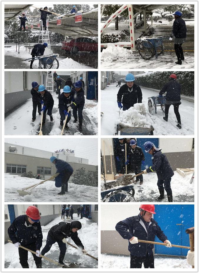 今年的雪來勢兇猛,全城開啟“冰雪奇緣”模式。廠區(qū)道路、屋面、車棚、樹木被積雪覆蓋,給全體員工的出行帶來不便。但“CJE 常捷科技”在銀裝素裹下更顯熠熠生輝。